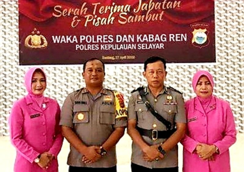 Kapolres Selayar AKBP Taovik Ibnu Subarkah menjadi inspektur upacara serah terima jabatan (sertijab) dan pisah sambut Wakapolres Selayar dan Kabag Ren Polres Selayar, yang berlangsung di Aula Endra Dharmalaksana Polres, Kepulauan Selayar, Sabtu (27/04/2019).
