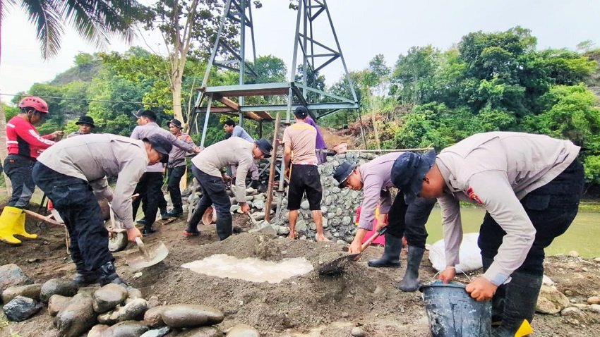 Brimob Turut Percepat Pembangunan Jembatan Gantung di Soppeng