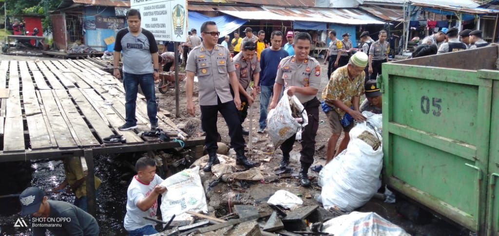 Kapolres Gowa bersama anggotanya membersihkan tumpukan sampah tersebut. Bersama puluhan personel Unit 1 Turjawali Sabhara, bahu-membahu membersihkan halaman pasar.