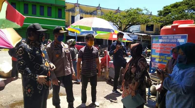 Kapolres Luwu Utara dan Kepala Dinas P2KUKM melakukan sosialisasi pencegahan covid-19 di Pasar Sentral Masamba, Kamis(9/4/2020).