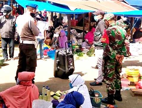 Tim terpadu Desa Batangmata melaksanakan sosialisasi imbauan pemerintah dan maklumat Kapolri serta membagikan masker kepada masyarakat yang datang berbelanja kebutuhan bahan pokok di Pasar Batangmata, Kecamatan Bontomatene, Kabupaten Kepulauan Selayar, Sabtu (11/04/2020).