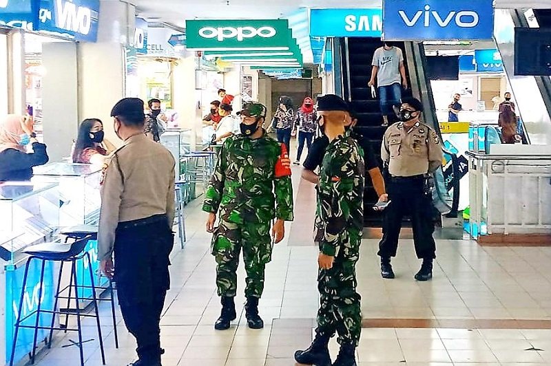 Kepolisian Resor (Polres) Pelabuhan Makassar bersama TNI menggelar patroli penertiban masyarakat di pusat perbelanjaan, Mal MTC Karebosi dalam rangka mencegah penyebaran Covid-19, Sabtu (25/07/2020).