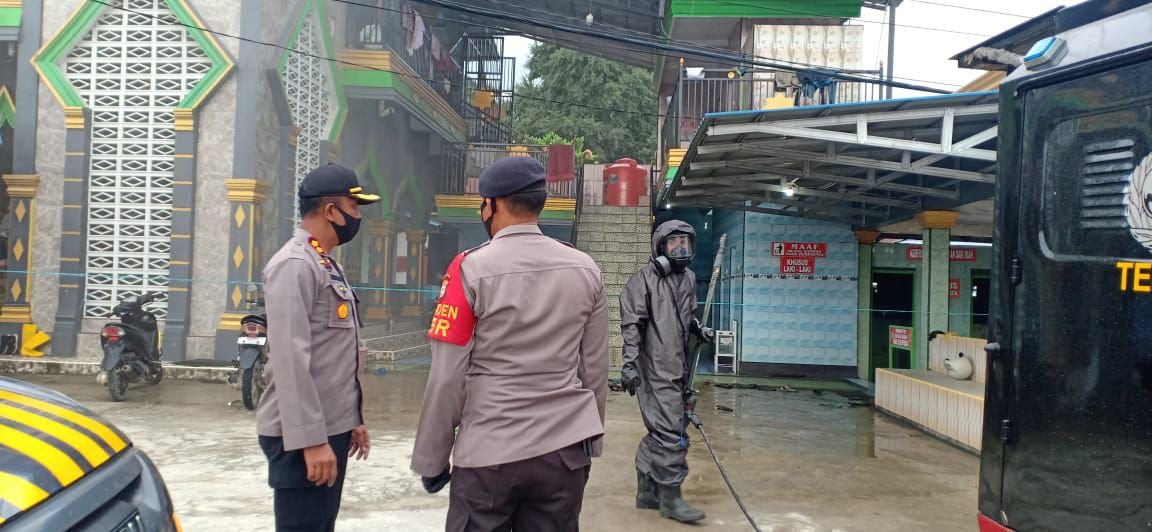 Polisi Resort (Polres) Luwu Utara (Lutra), Sulawesi Selatan (Sulsel) bersama Tim Brimob dan para pengungsi yang berada di tempat pengungsian terutama di Masjid Kurri-Kurri, Kelurahan Bone Tua Kecamatan Masamba. Rumah mereka yang terendam banjir lumpur, belum bisa ditempati kembali dan dilakukan penyemprotan disinfektan pada hari, Minggu (26/7/2020).