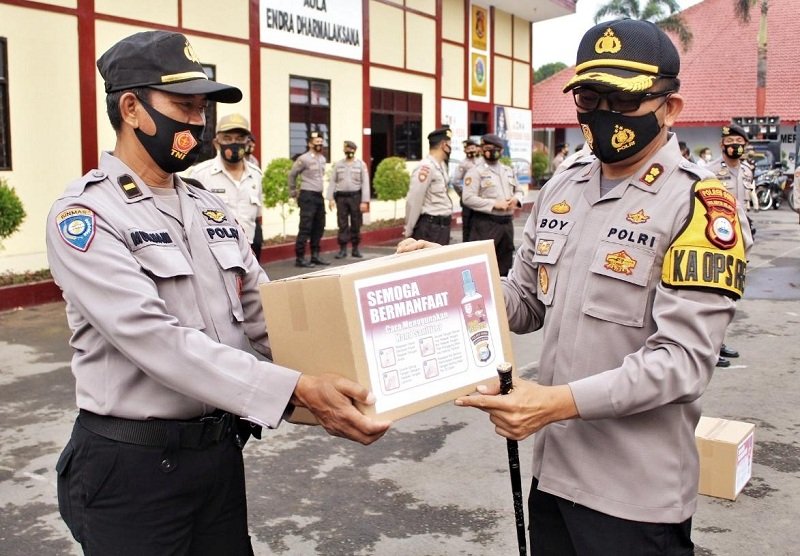 Pada pelaksanaan apel pagi, Kamis (06/08/2020), Kapolres Gowa AKBP Boy FS Samola, SIK secara simbolis menyerahkan cairan Hand Sanitizer kepada Kepala Satuan Unit untuk selanjutkan dibagikan keseluruh personel Polres Gowa dan Polsek jajaran.