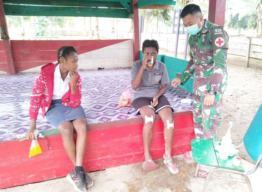 Satgas Pamtas RI-PNG Yonif Mekanis Raider (MR) 413 Kostrad membantu pengobatan dua siswi SMP Kampung Pitewi, Distrik Arso Timur, Kabupaten Keerom yang terjatuh dari motor akibat kondisi jalan yang licin, Kamis (06/08/2020).
