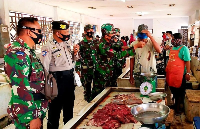 Mengantisipasi penyebaran virus Corona atau Covid-19, Bhabinkamtibmas Kelurahan Mataallo, Polsek Bajeng, Polres Gowawa, Aiptu H Nurbadri bersama personel Koramil 06 Bajeng memberikan imbauan kepada pedagang dan pengunjung di Pasar Sentral Limbung, Kelurahan Mataallo, Kecamatan Bajeng, Kabupaten Gowa, Minggu (16/08/2020) pagi.