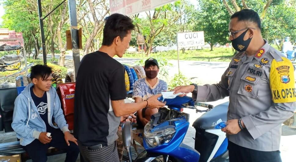 Razia masker dipimpin langsung Kapolres di tempat-tempat publik seperti di bengkel motor di Baloli Desa Baebunta Kecamatan Baebunta bagikan masker kepada warga yang ditemui yang tidak memakai masker.