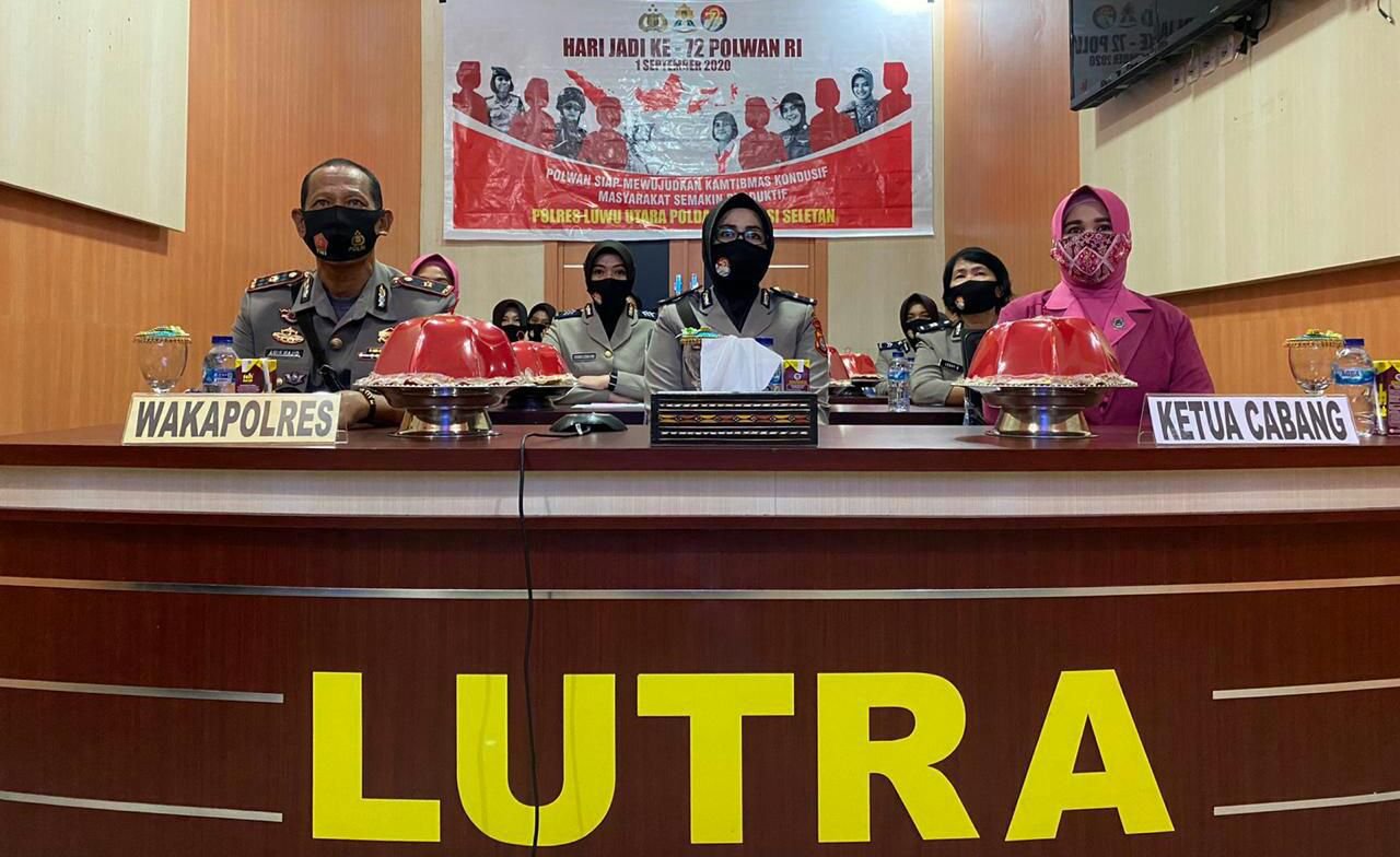 Dalam rangka memperingati Hari Jadi Polwan Republik Indonesia ke- 72 Tahun 2020, Polres Luwu Utara menggelar acara syukuran bertempat di ruangan Vicon Polres Lutra, Selasa (1/9/2020) sekitar pukul 10.30 Wita.