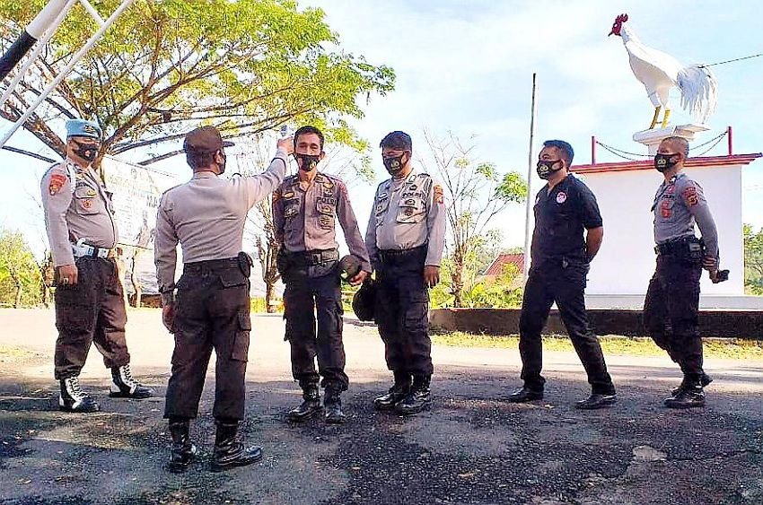 Nampak terlihat Waka Polsek Parangloe Iptu Agus Muthalib didampingi Kanit Provos Aiptu Ratiman melakukan pemeriksaan suhu tubuh personel sebelum memasuki Kantor Polsek Parangloe. Satu persatu personel diperiksa suhu tubuhnya menggunakan thermogun sebelum melaksanakan apel pagi.
