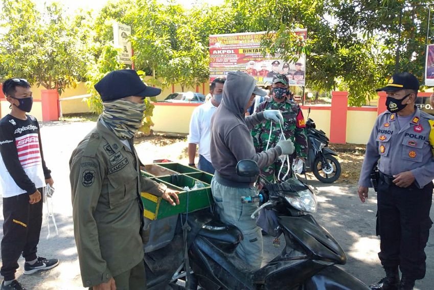 Personil Polsek Barombong, Polres Gowa, TNI, Camat serta personil Polisi Pamaong Praja Kecamatan Barombong, melaksanakan Operasi Yustisi penggunaan masker yang dilaksanakan di jl. Poros Kanjilo Barombong, Kabupaten Gowa, Rabu (16/9/2020) siang.