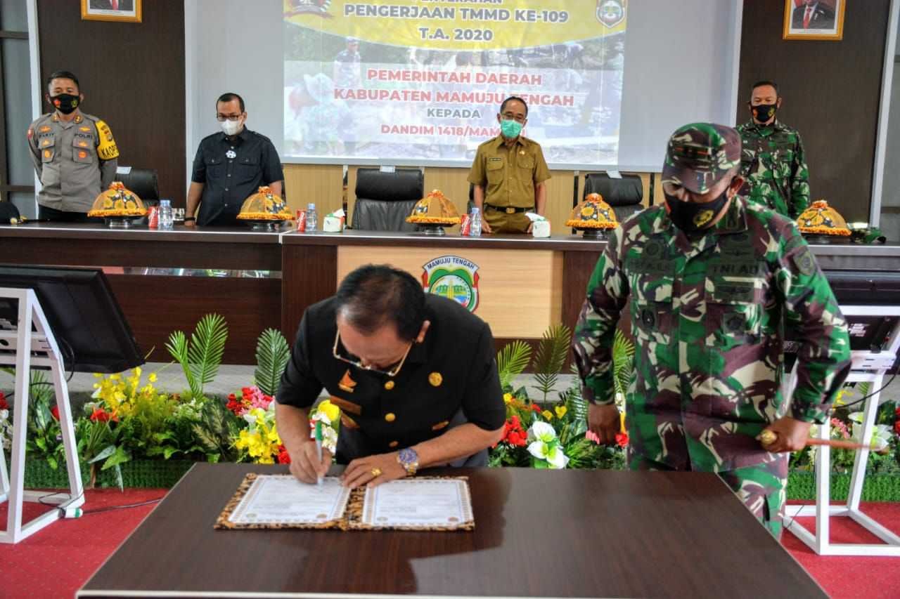 Pembukaan TMMD ke-109 TA 2020 Kodim 1418/Mamuju sekaligus penandatanganan dan penyerahan berita acara serah terima Program TMMD dilaksanakan di Aula Kantor Bupati Mamuju Tengah oleh Bupati Mamuju Tengah H. Aras Tammauni dan Komandan Kodim 1418/Mamuju Letkol Inf Tri Aji Sartono, Selasa (22/9/2020)