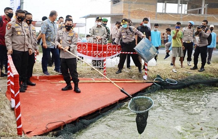 Di lokasi pembudidayaan ikan air tawar binaan Polres Sergai ini, Komjen Pol Agus Andrianto turut menebar 10 ribu bibit ikan nila, ikan patin, dan gurame.