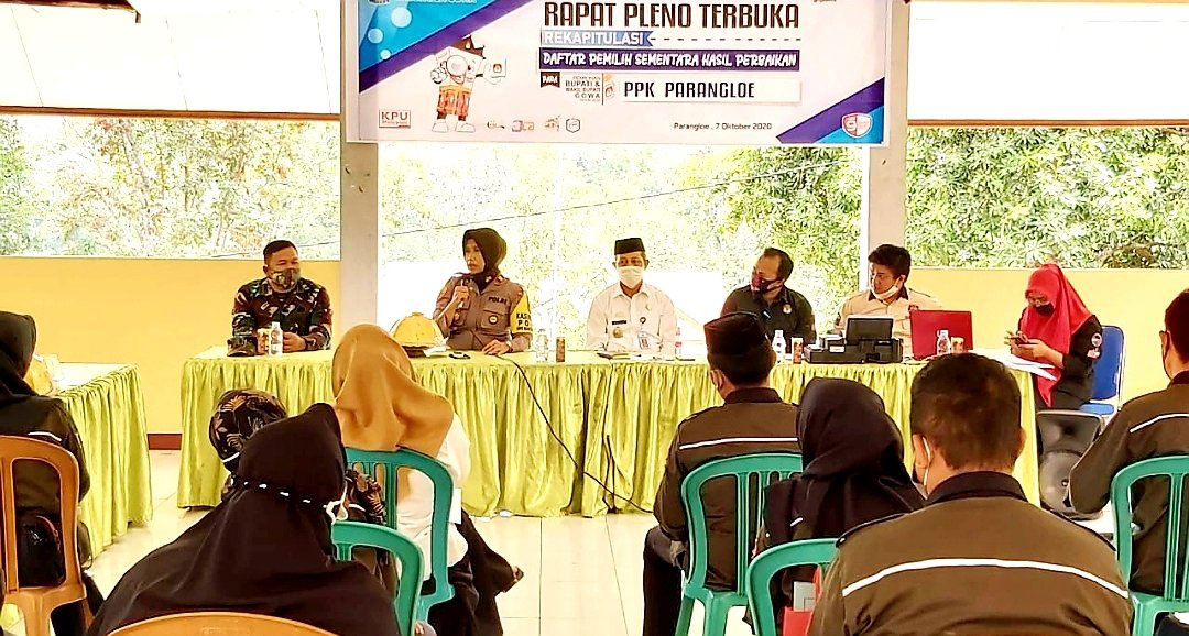 Kapolsek Parangloe Polres Gowa Iptu Kasmawati, S.Sos menghadiri kegiatan Rapat Pleno Terbuka Rekapitulasi Daftar Pemilih Sementara Hasil Perbaikan (DPSHP) Tingkat Kecamatan untuk Pemilihan Bupati dan Wakil Bupati Kabupaten Gowa tahun 2020, bertempat di Aula Kantor Kelurahan Lanna, Kecamatan Parangloe, Kabupaten Gowa, Rabu (07/10/2020).