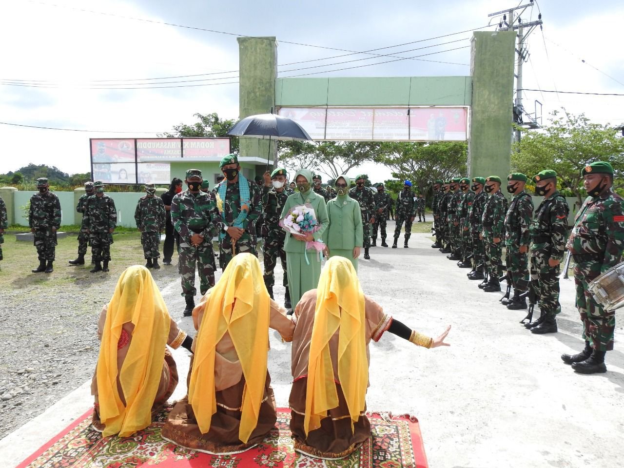 Tari Najwa penjemput tamu dan pengalungan bunga juga mewarnai prosesi penerimaan kunjungan Danrem 142/Tatag bersama Ketua Persit KCK Koorcab Rem 142 dan rombongan.