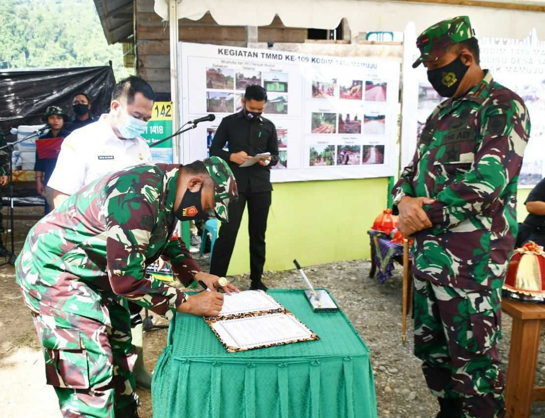 Penandatanganan dan penyerahan hasil pekerjaan Satgas TMMD 109 di Dusun Salolisu Desa Salundeang, Kecamatan Tobadak, Kabupaten Mamuju Tengah, Sulawesi Barat (Sulbar) berlangsung di lokasi TMMD dalam nuansa yang sangat sederhana dengan mengikuti protokol Kesehatan Covid-19, Rabu (21/10/2020).