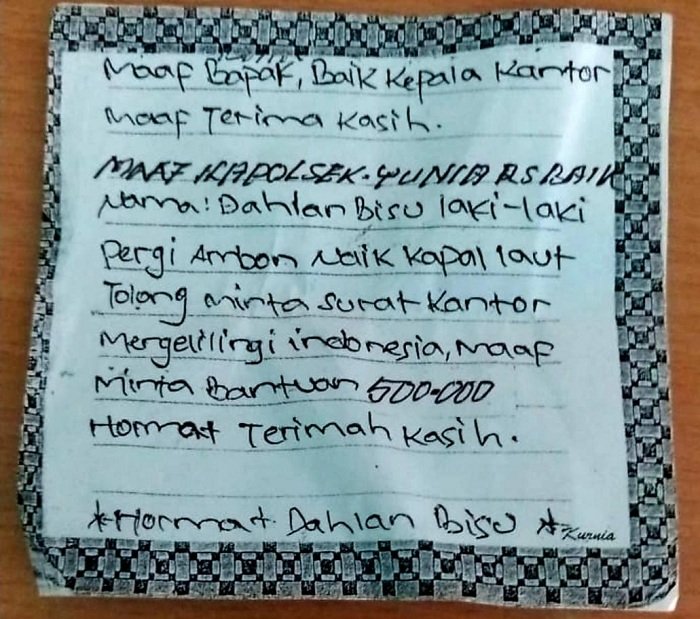 Dari identitas yang dibawa, tunawicara tersebut diketahui bernama Dahlan (45). Walaupun sempat terkendala dalam berkomunikasi, tunawicara tersebut kemudian menulis pada selembar kertas dan meminta biaya sebesar Rp 500.000,- untuk perjalanan pulang kampung menggunakan kapal laut ke Ambon.