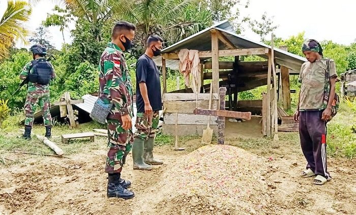 Sebagai wujud kepedulian dan empati serta duka cita yang mendalam terhadap musibah yang dialami salah satu warga di perbatasan, Pos Km.140 Satgas Pamtas Yonif 312 Kala Hitam membantu menyiapkan pemakaman mendiang Ibu Dedimah Atiape (45), di Kampung Monggoefi, Distrik Yafi, Kabupaten Keerom, Papua, Sabtu (24/10/2020).