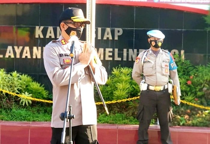 Diakhir masa tugas sebagai Kapolres Gowa, AKBP Boy FS Samola pada Senin (26/10/2020) pagi sekira pukul 07.30 Wita memimpin pelaksanaan apel pagi.