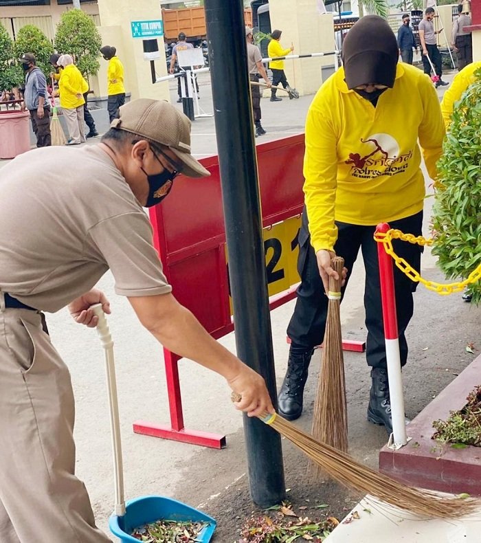 Tampak personel pun begitu bersemangat membersihkan halaman Kantor Polres Gowa.