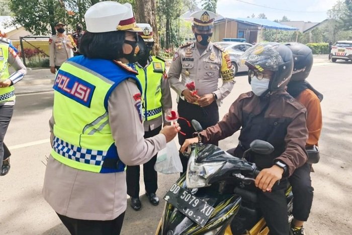 Para personel Sat Lantas Polres Gowa memberhentikan kendaraaan baik motor maupun mobil yang melintas, bukan untuk diperiksa surat-surat kendaraan atau menindak dengan tilang, melainkan membagikan bunga kepada para pengendara.