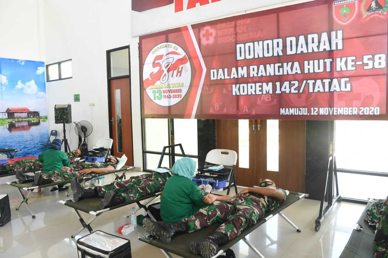 Donor darah adalah salah satu rangkaian kegiatan yang dilaksanakan dalam rangka menyambut HUT ke-58 Korem 142/Tatag di Aula Andi Depu Korem 142/Tatag Jl. Abd. Malik Pattana Endeng, Mamuju, Provinsi Sulbar, Kamis (12/11/2020).