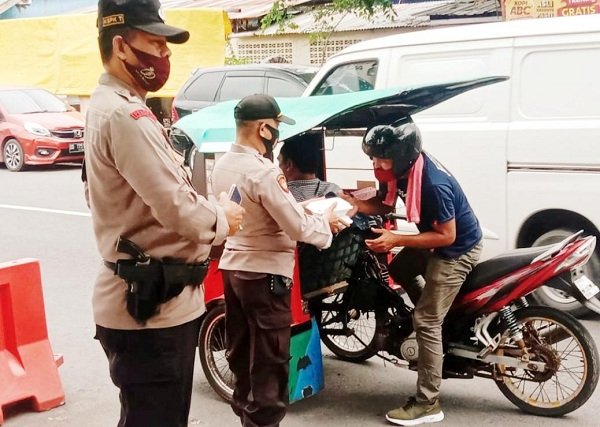 Anggota turun berinteraksi langsung dengan masyarakat sambil memberikan imbauan untuk tetap menerapkan protokol kesehatan khususnya menggunakan masker saat beraktivitas.