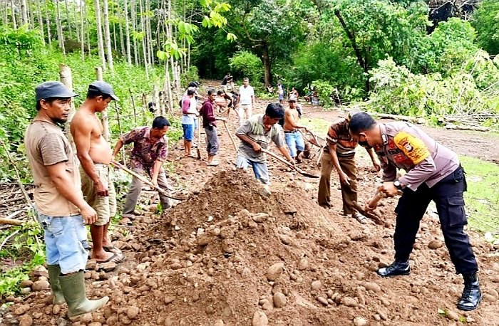 Tanpa takut kotor, Bhabinkamtibmas juga memegang sekop dan mengerjakan semuanya untuk membantu warganya membuat jalan tani menuju pekuburan kampung.