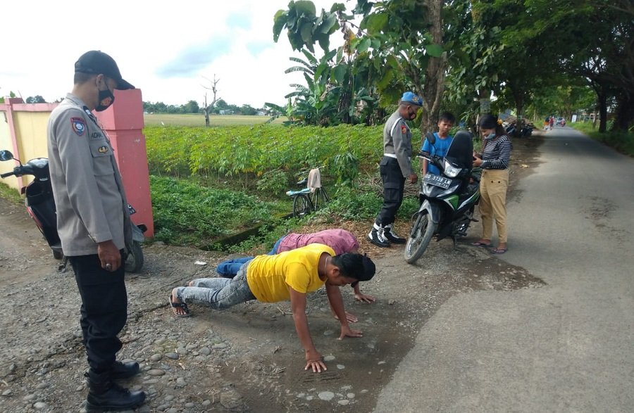 Nampak Ipda Bahktiar dan Aiptu Jhoni Manopo kanit Sabhara bersama anggota jaga memberikan edukasi pada Masyarakat serta juga teguran bagi warga pengendara RD. 2 /RD. 4 yang tidak patuhi Protokol kesehatan dan juga memberikan sangsi berupa hukuman fisik .