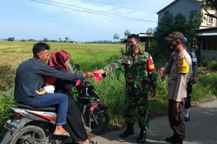 Nampak Iptu Muh Ali dan Danposramil Barombong Pelda Ismail bersama anggota jaga memberikan edukasi pada Masyarakat serta juga teguran bagi warga pengendara RD. 2 /RD. 4 yang tidak patuhi Protokol kesehatan dan juga memberikan sangsi berupa hukuman fisik .