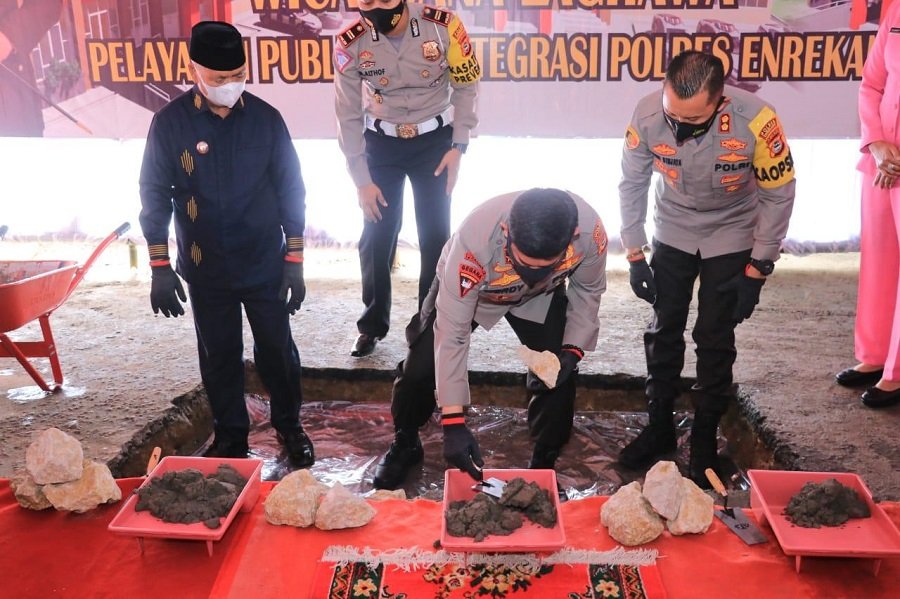 Kapolda Sulsel, Irjen Pol. Drs. Merdisyam, M.Si., menandatangani Prasasti dan meletakkan Batu Pertama pembangunan Gedung Pelayanan publik Terintegrasi “Wicaksana Laghawa” Polres Enrekang, Jumat (09/4/21).