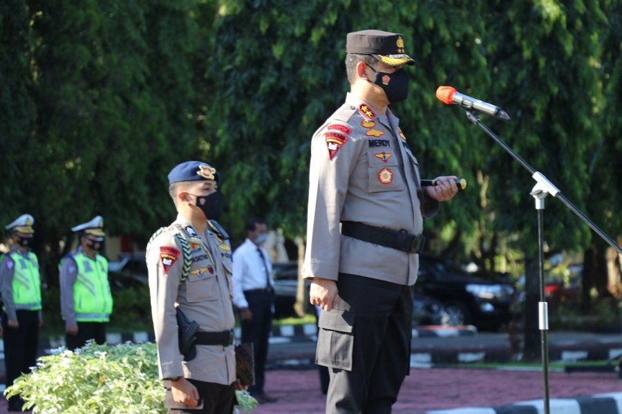 Kepolisian Daerah Sulawesi Selatan melaksanakan Gelar Pasukan Ops Kepolisian Mandiri Kewilayahan Keselamatan 2021, di Lapangan upacara Mapolda Sulsel,