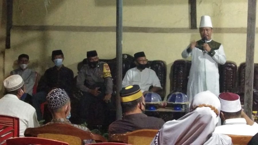 Sebelum acara dimulai Aiptu Muh Ismail menyempatkan diri mengajak jamaah takziah yang hadir tetap menerapkan protokoler covid-19.