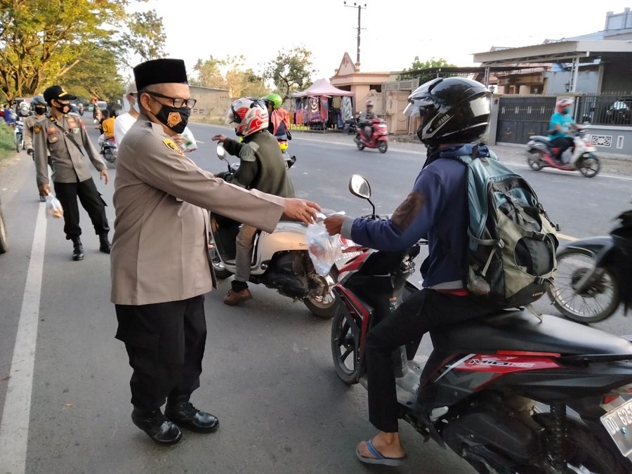 Pembagian takjil itu dibagikan kepada warga dan pengendara sepeda motor maupun roda empat yang melintas di jalan Poros Limbung, tepatnya depan Mako Polsek Bajeng.