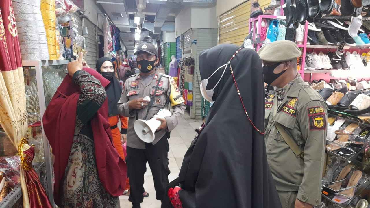 Kepolisian Resor Pelabuhan Makassar melalui Tiga Pilar yang berada di Kecamatan Wajo mengingatkan masyarakat di pasar grosir Butung untuk menerapkan protokol kesehatan guna mencegah penularan Corona Virus Disease 2019 (Covid-19).