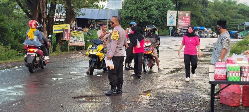 Hadir ketua ranting Bhayangkari Ny. Anni Jamal dengan antusias membagi takjil kepada pengendara yang melintas didepan Polsek Manuju didampingi personil.