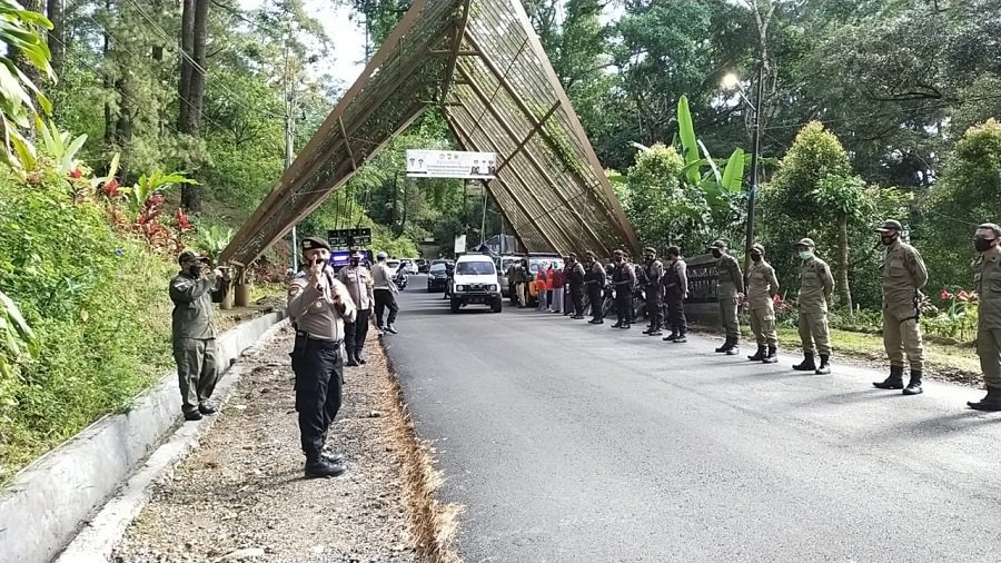 Petugas gabungan Kepolisian, TNI, Satpol PP Dinas kesehatan dan LSM melakukan filtrasi atau penyaringan terhadap masyarakat yang akan berwisata ke kota bunga Malino pada Sabtu pagi hingga siang ini (15/5/21).