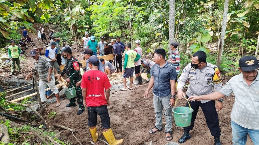 Sinergitas Bhabinkamtibmas Desa Timbuseng Polres Gowa Bripka Ansyar bersama Babinsa Serka Abdul Salam dan warga binaannya melakukan kerja bakti membuat jembatan menuju pekuburan di Dusun Bollangi Desa Timbuseng Kecamatan Pattallassang Kab. Gowa, Sabtu 22/05/2021 pagi.