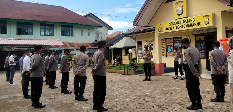 Kapolsek Bontomarannu Iptu Bahtiar, S.Sos, SH, MH pimpin apel pagi sebagai awal dari pelaksanaan tugas dihalaman Mapolsek Bontomarannu, Senin 24/05/2021 pagi.