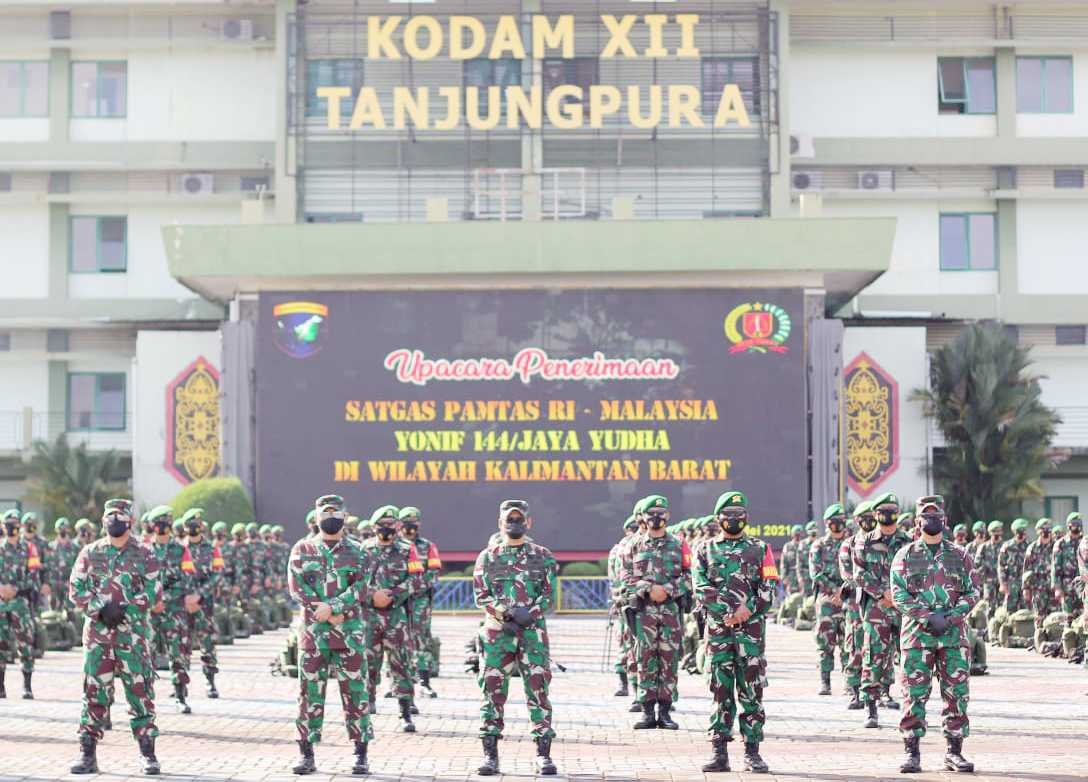Panglima Kodam XII/Tanjungpura (Tpr), Mayjen TNI Muhammad Nur Rahmad selaku Pangkoopsdam XII/Tpr memimpin langsung upacara penyambutan Satgas Pamtas RI-Malaysia Batalyon Infanteri 144/Jaya Yudha (JY) di lapangan Tidayu, Makodam XII/Tpr.