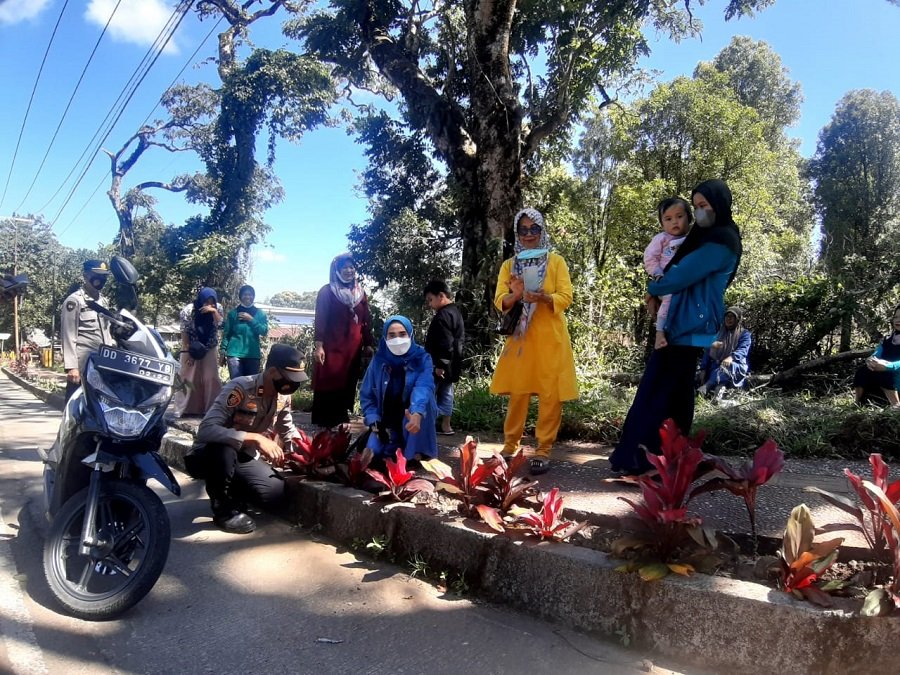 Kegiatan Kapolsek di peremajaan tanaman untuk mendukung Malino sebagai kota bunga.