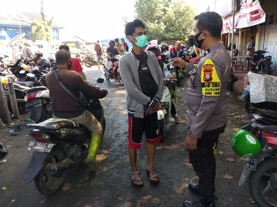 Mendukung program pemerintah dalam menekan penyebaran Covid-19 di tempat fasilitas umum seperti stasiun/terminal/pelabuhan hingga Pasar Ikan, Bhabinkamtibmas Gusung Aipda Naharuddin memberikan pengamanan dan edukasi protokol kesehatan kepada masyarakat yang beraktifitas di Tempat Pelelangan Ikan (TPI) Paotere.