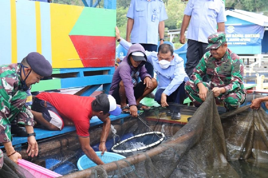 Dalam mensejahterakan ekonomi masyarakat pesisir, Pangkalan TNI Angkatan Laut (Lanal) Lampung yang dipimpin Komandan Lanal Lampung Kolonel Laut (P) Nuryadi melaksanakan panen raya Ikan Kakap Putih dan Ikan Bawal Bintang, bertempat di Keramba Jaring Apung (KJA) Lanal Lampung, Dusun Warnasari, Desa Durian, Kecamatan Padang Cermin, Kabupaten Pesawaran, Lampung, Senin (31/05/2021).