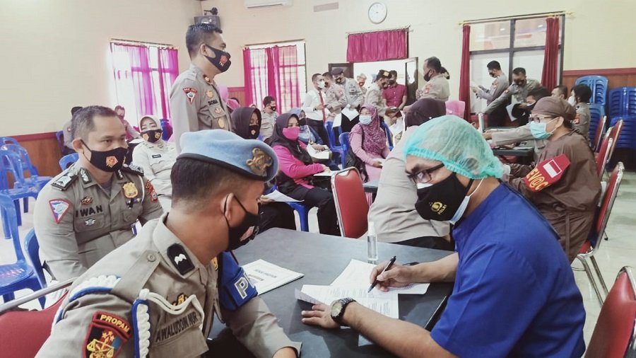 Bid Dokkes Polda Sulsel melaksanakan penyuntikan vaksinasi kepada personil Polres Gowa dan keluarga pada senin (7/6/2021) di Aula Endra Dharmalaksana.