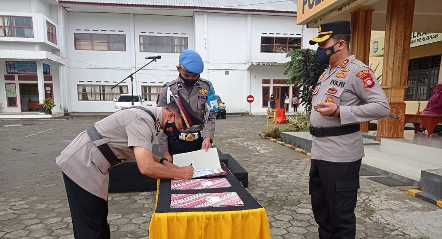 Semua personil yang hadir mengikuti serah terima jabatan Kasat Reskrim tetap ikuti aturan protokol kesehatan di hakaman Mapolres Toraja Utara.