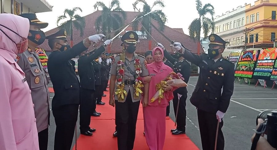 Pasca berakhirnya rangkaian kegiatan penyambutan dan laporan kesatuan, Pejabat Lama Kapolres Gowa AKBP Budi Susanto dilepas dengan upacara kehormatan Farewel Kamis (17/6/2021) pukul 17.45 WITA.