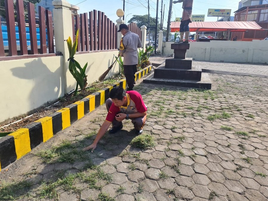 Mari kita peduli dengan kebersihan sebab semua itu adalah sebagian dari iman serta apabila halaman dan kantor bersih maka kita akan betah dan senang bekerja dilingkungan kantor, ucap IPTU Nasruddin, SH, MH.