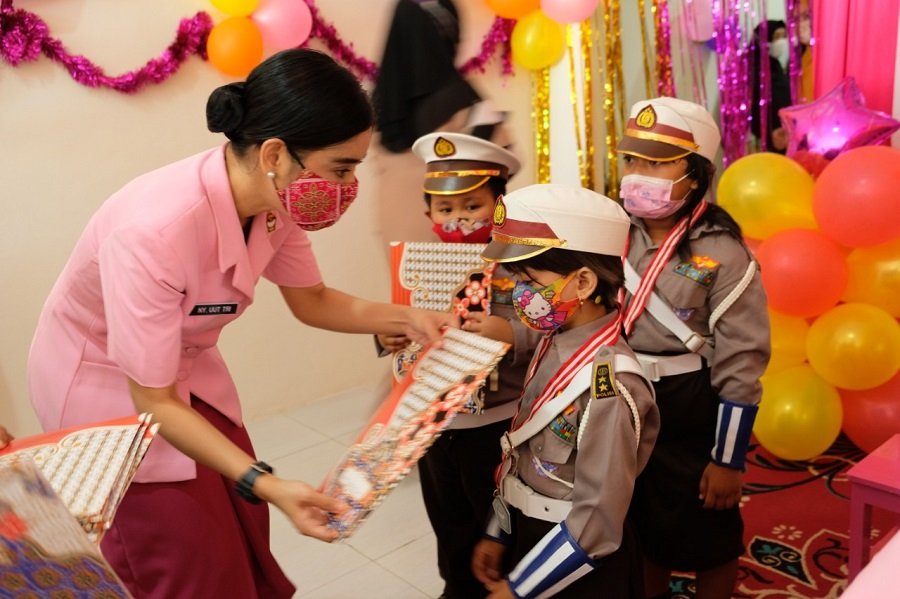 Ketua Bhayangkari Cabang Gowa yang juga sebagai Ketua Yayasan TK Kemala Bhayangkari 07, Ibu Ny. Uut Tri Goffarudin. P menyerahkan langsung Rapor kelulusan ke 55 murid TK Kemala Bhayangkari 07 Cabang Gowa, Senin (28/6).