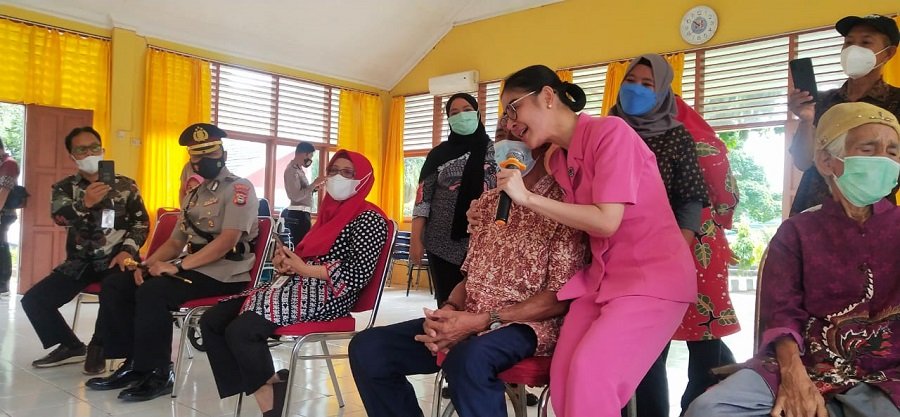 Walau dengan deraian air mata, Ketua Bhayangkari Cabang Gowa Ny. Uut Tri Goffarudin saat menemui lansia yang sementara terbaring sakit diatas tempat tidur.