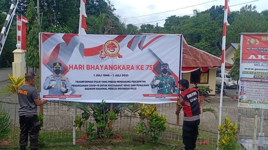 Dalam rangka menyambut hari Bhayangkara ke 75 yang jatuh pada tanggal 1 Juli 2021. Pemasangan spanduk ucapan tersebut di pasang di depan Mako Polsek Parangloe. Selasa (29/06/2021) siang.