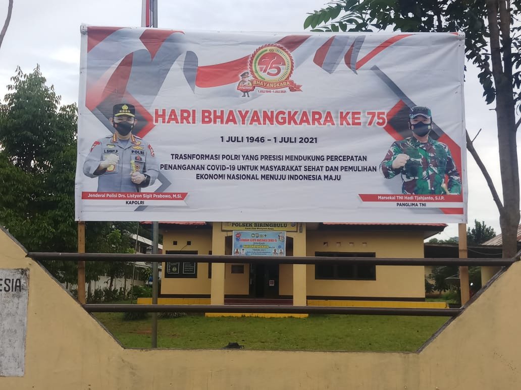 Dalam rangka menyambut hari ulang tahun Bhayangkara yang ke 75 yang jatuh pada tanggal 1 Juli 2021 Polsek Biringbulu Polres Gowa memasang spanduk Kapolri didepan Kantor Polsek , rabu (30/6/2021).